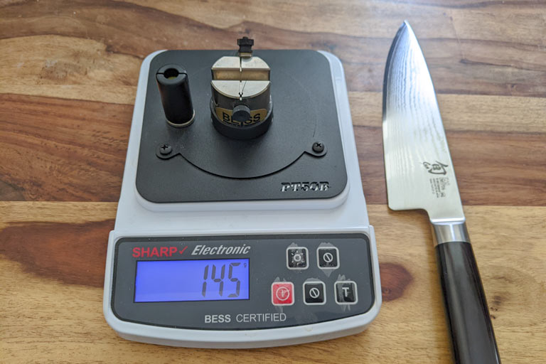 Die Schärfe wurde mit einem Schärfemessgerät für Messer gemessen (Bild 2) und ist recht ordentlich. (alles unter 200 gilt als rasiermesserscharf)
