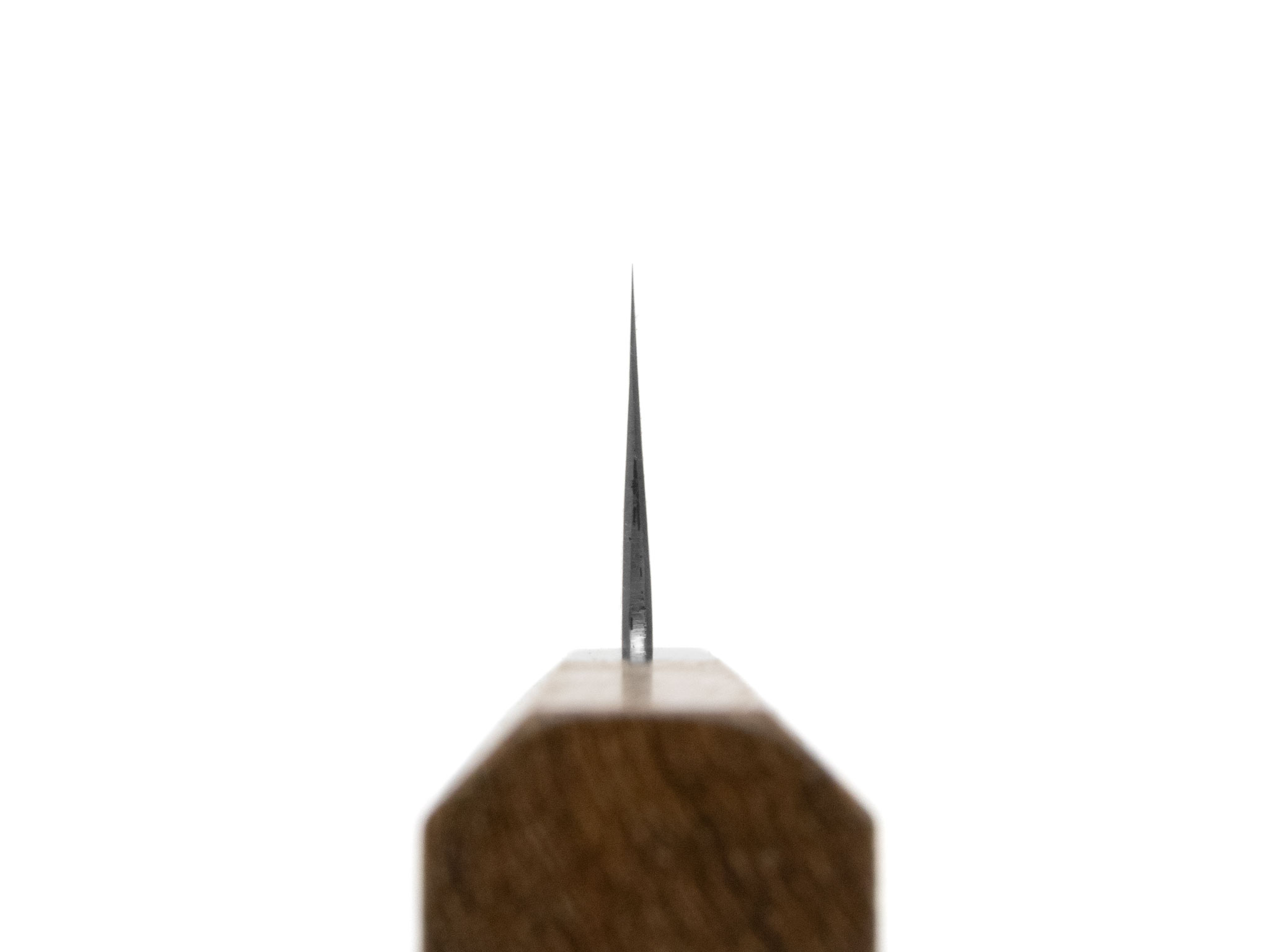 Die Schneidlage besteht aus Ginsan #3. Ginsan ist ein hervorragender & sehr pflegeleichter japanischer Edelstahl. Er lässt sich super einfach schleifen (fast wie Carbonstahl), hat ein sehr feines Stahlgefüge und erreicht dadurch eine ausgezeichnete Schärfe, gleichzeitig ist er relativ zäh & unempfindlich. Ginsan ist aufgrund seiner Eigenschaften außerdem sehr gut für Anfänger geeignet.