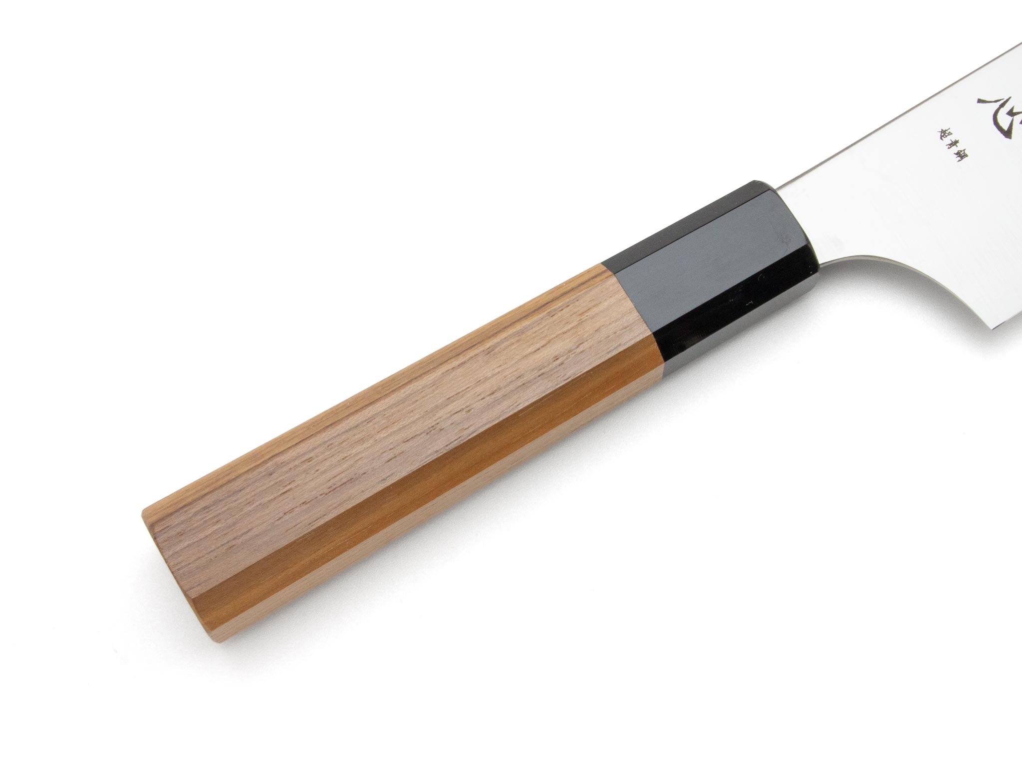 Die Schneidlage besteht aus nicht rostfreiem Aogami Super der Härte 63-64 HRC. Aogami Super gilt als einer der besten Messerstähle, weil außerordentliche Schärfe erreicht, eine ausgezeichnete Schnitthaltigkeit hat und sich trotz der Härte einfach schleifen lässt.