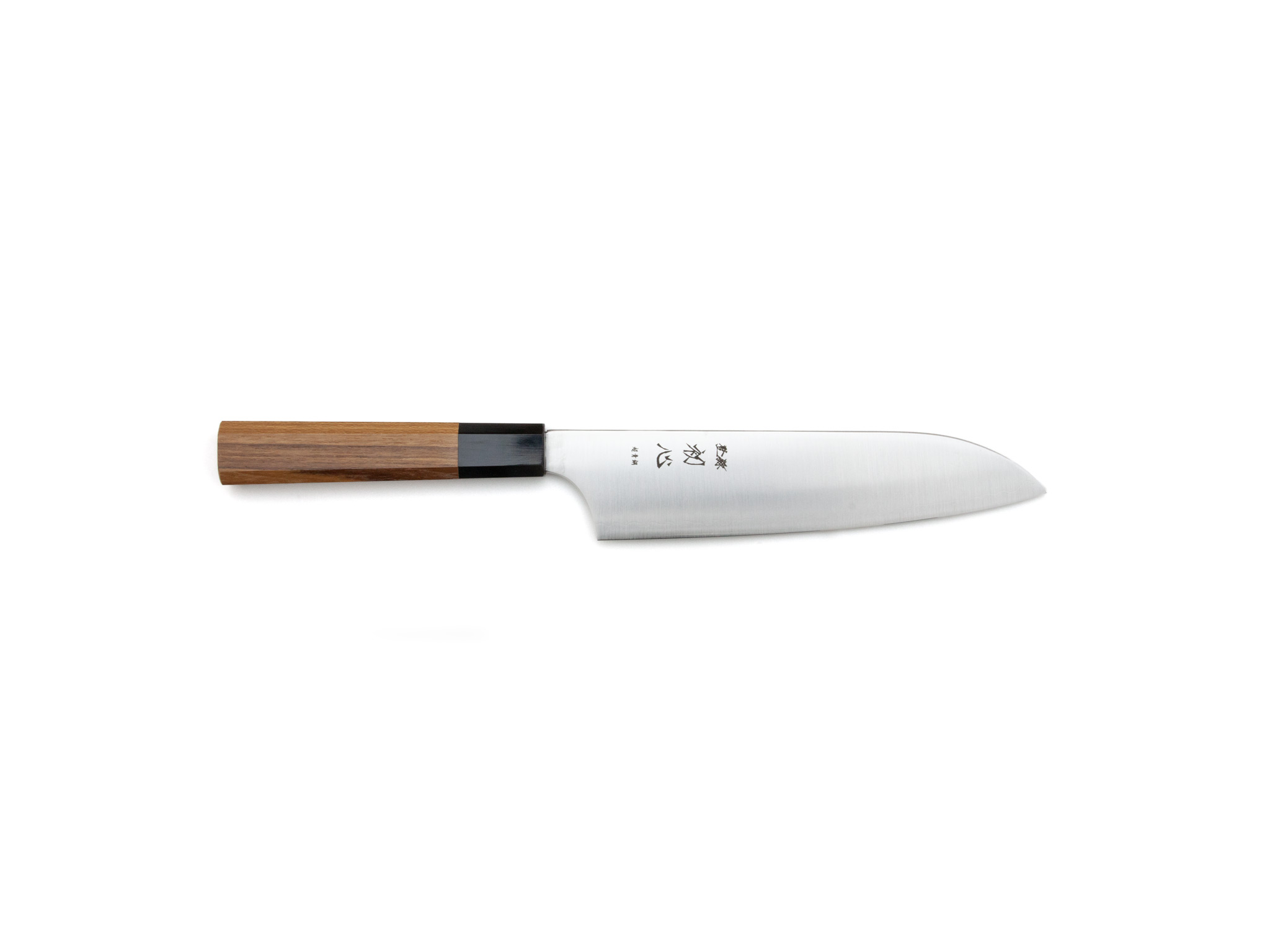 Das Santoku ist ein handliches japanisches Allzweckmesser. Es eignet sich zum Schneiden von knochenlosem Fleisch & Fisch, Gemüse und Früchten. Santokus sind ideal für den Hausgebrauch und für alle, die handliche Küchenmesser bevorzugen.