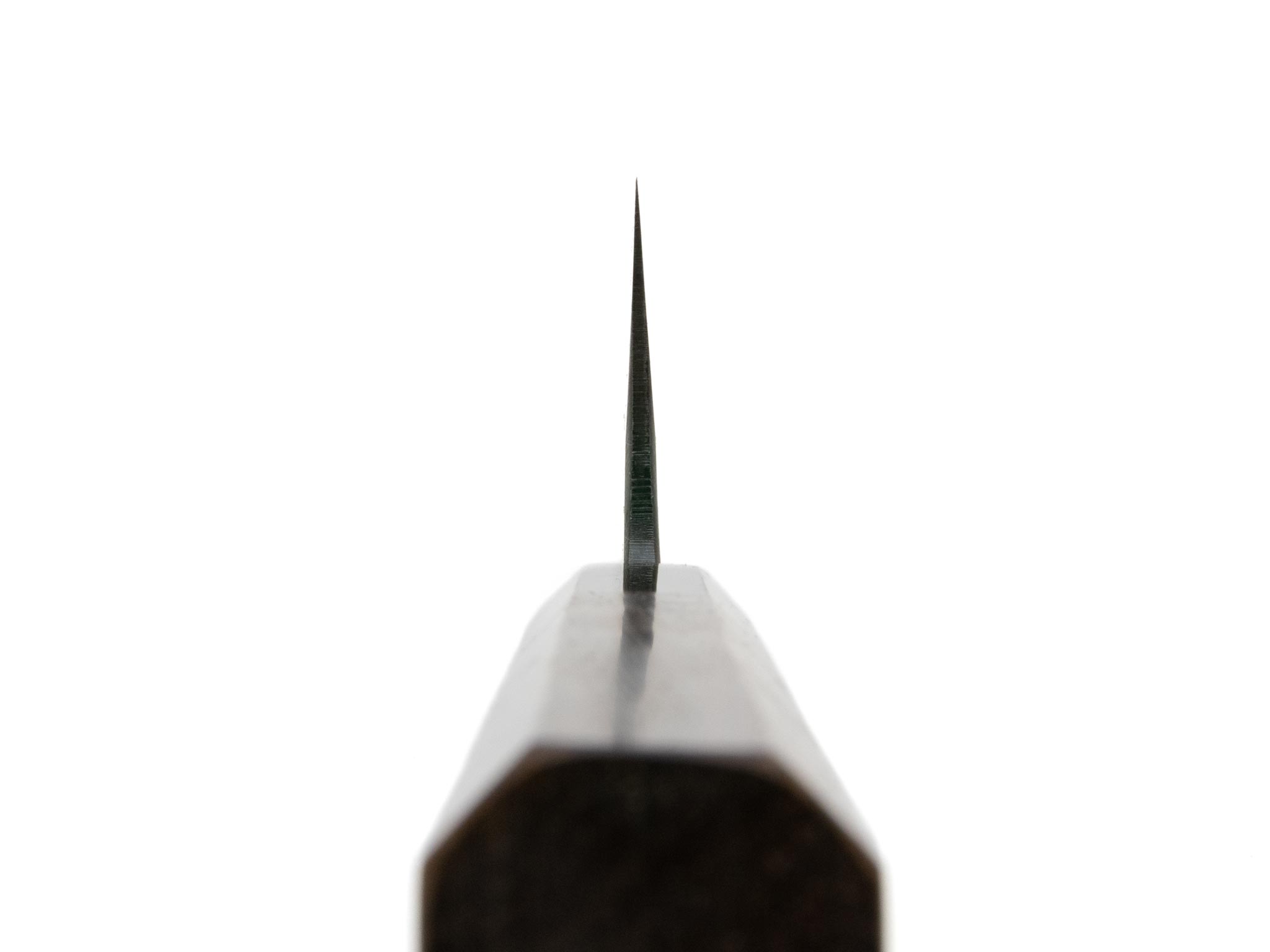 Aogami #2 (auch Blue #2 oder Blauer Papierstahl #2) ist sehr beliebter japanischer Carbonstahl. Er hat eine sehr gute Schnitthaltigkeit, lässt sich sehr einfach schleifen und erreicht eine hervorragende Schärfe. Aogami #2 ist im Vergleich zu Aogami Super etwas reaktiver und nicht ganz so schnitthaltig, dafür lässt er sich einfach schleifen und ist preiswerter.