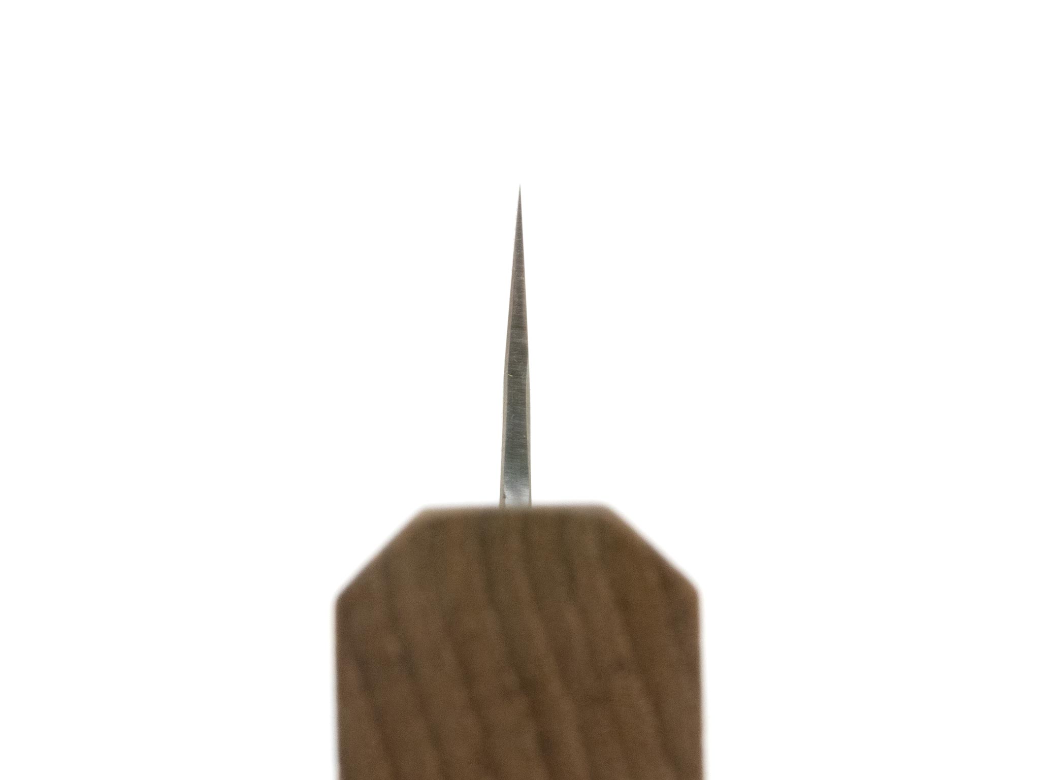 Die Schneidlage besteht aus (nicht rostfreiem) Shirogami #2 Carbonstahl. Shirogami hat eine leicht überdurchschnittliche Schnitthaltigkeit, er lässt sich dafür sehr schnell & sehr einfach schleifen und erreicht eine überragende Schärfe.
