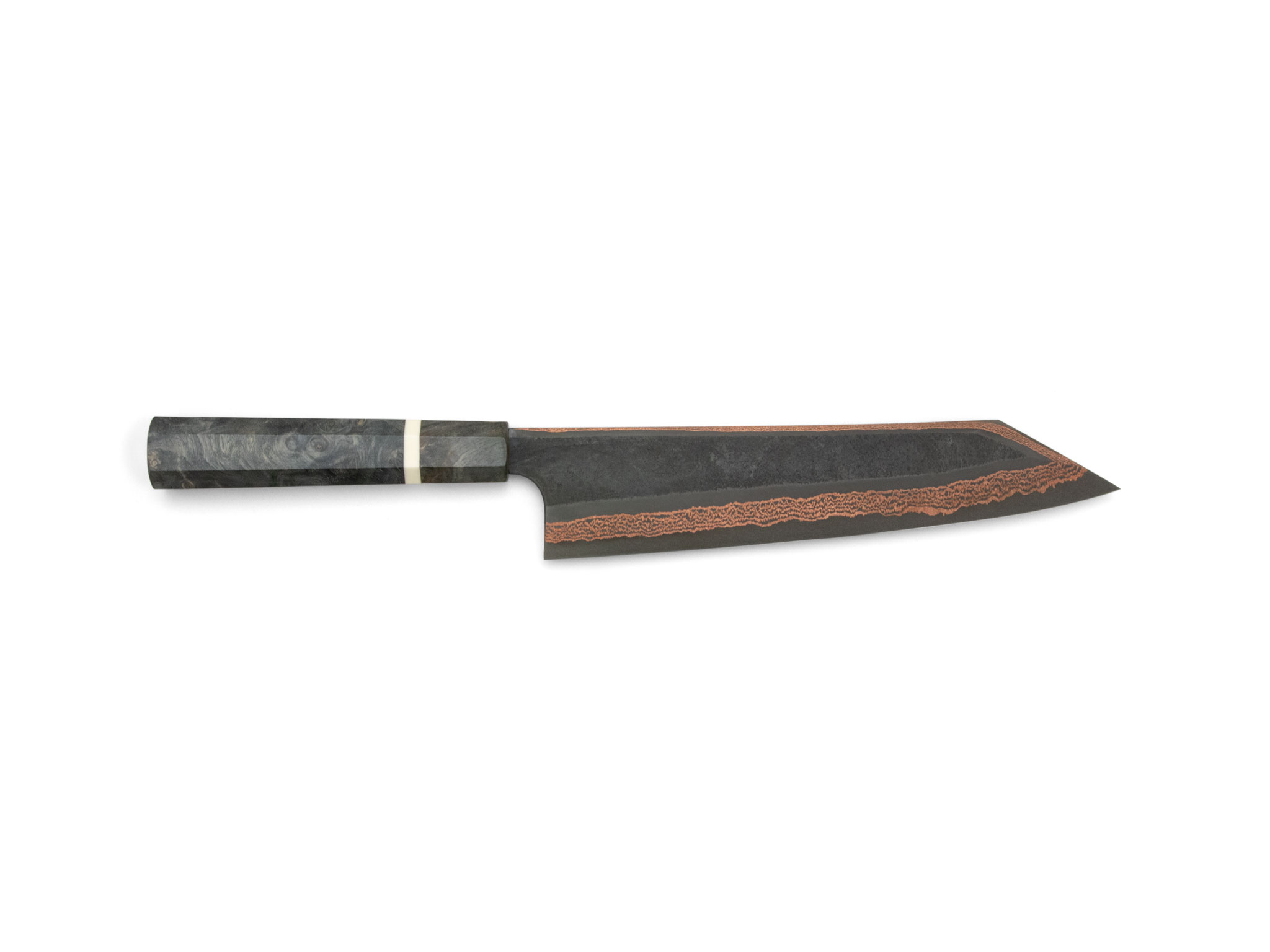 Diese schwarze Version der Yorokobi Serie lässt besonders viele Messerliebhaber-Herzen höher schlagen, weil sie – vor allem in Kombination mit dem Griff – so extrem sexy ist. Die komplette Klinge ist schwarz, sodass die kupfernen Regenbogendamastlagen besonders gut zur Geltung kommen.