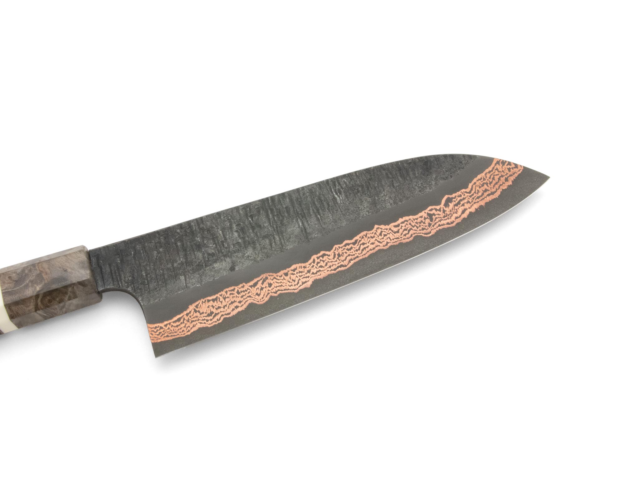 Diese schwarze Version der Yorokobi Serie lässt besonders viele Messerliebhaber-Herzen höher schlagen, weil sie – vor allem in Kombination mit dem Griff – so extrem sexy ist. Die komplette Klinge ist schwarz, sodass die kupfernen Regenbogendamastlagen besonders gut zur Geltung kommen. Zusätzlich hat diese Version ein Tsuchime Finish, was diese Version zwar etwas teurer, aber auch exklusiver macht.