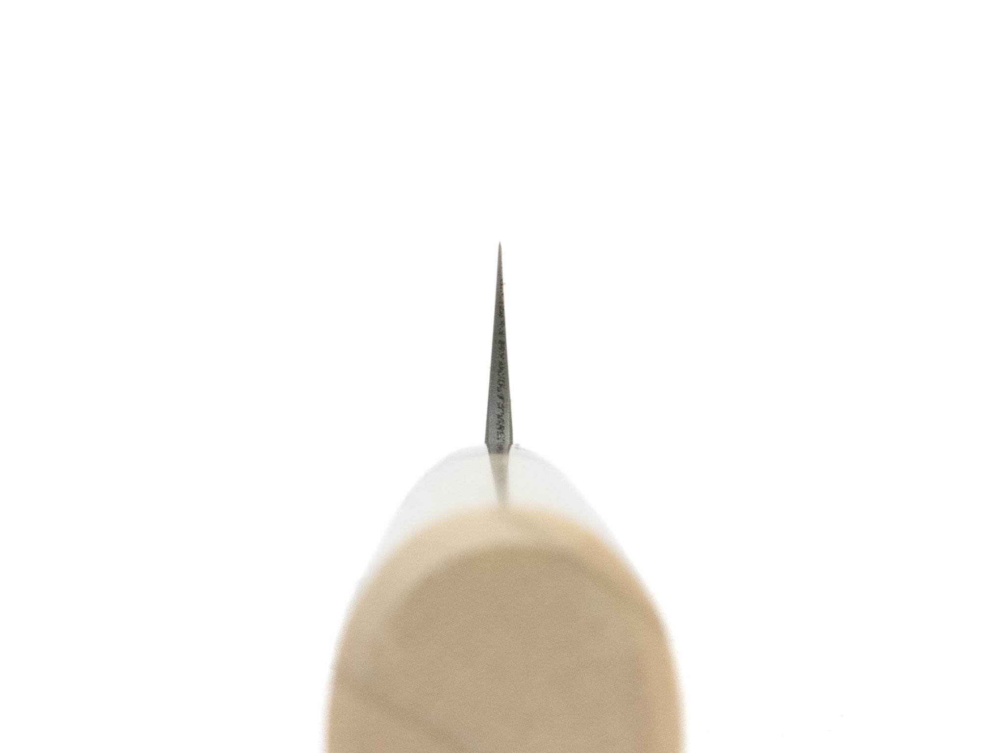 Die Schneidlage besteht aus (nicht rostfreiem) Shirogami #2 Carbonstahl. Shirogami hat eine leicht überdurchschnittliche Schnitthaltigkeit, er lässt sich dafür sehr schnell & einfach schleifen und erreicht eine überragende Schärfe.