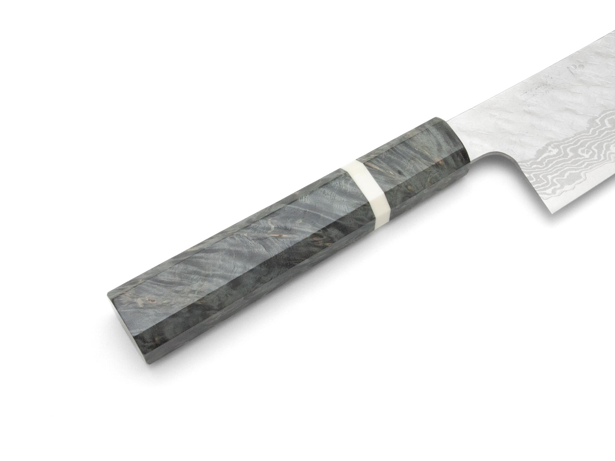 Die Nigara VG10 Tsuchime-Damascus Serie ist eine besonders schöne Serie von Nigara. Die Klinge ist aufgrund des Tsuchime-Damast-Finishs nicht nur wunderschön, sie besteht auch gänzlich aus Edelstahl und ist somit sehr pflegeleicht.
