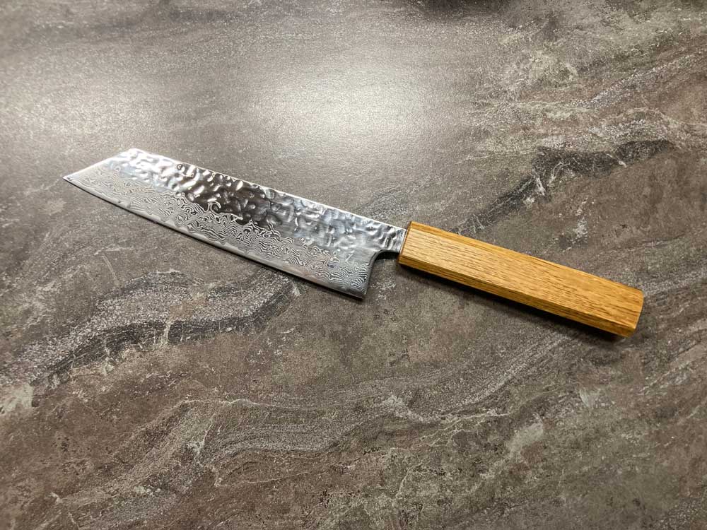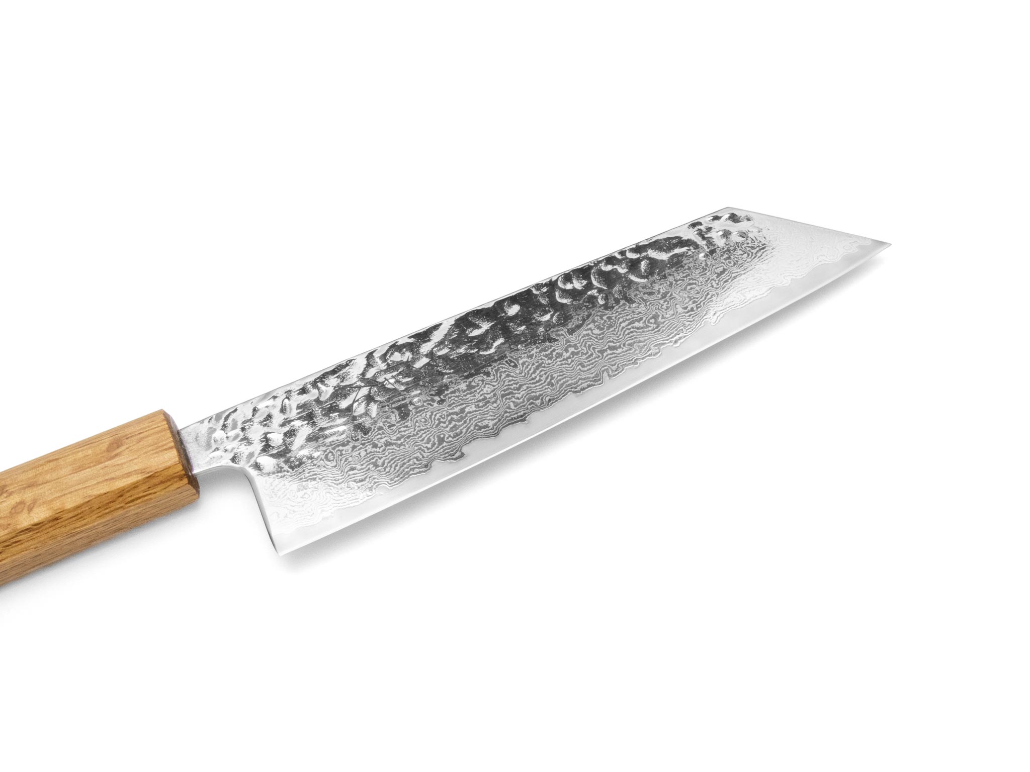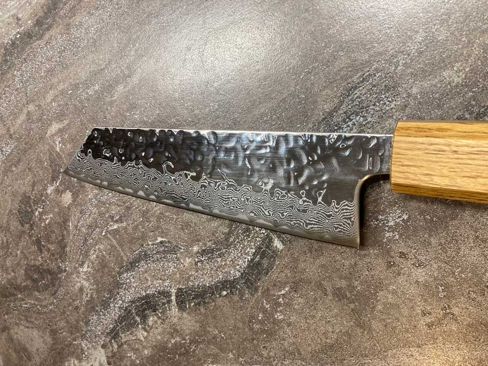 - Finish: Tsuchime & Damast-Finish (spiegelpolierte Klinge)