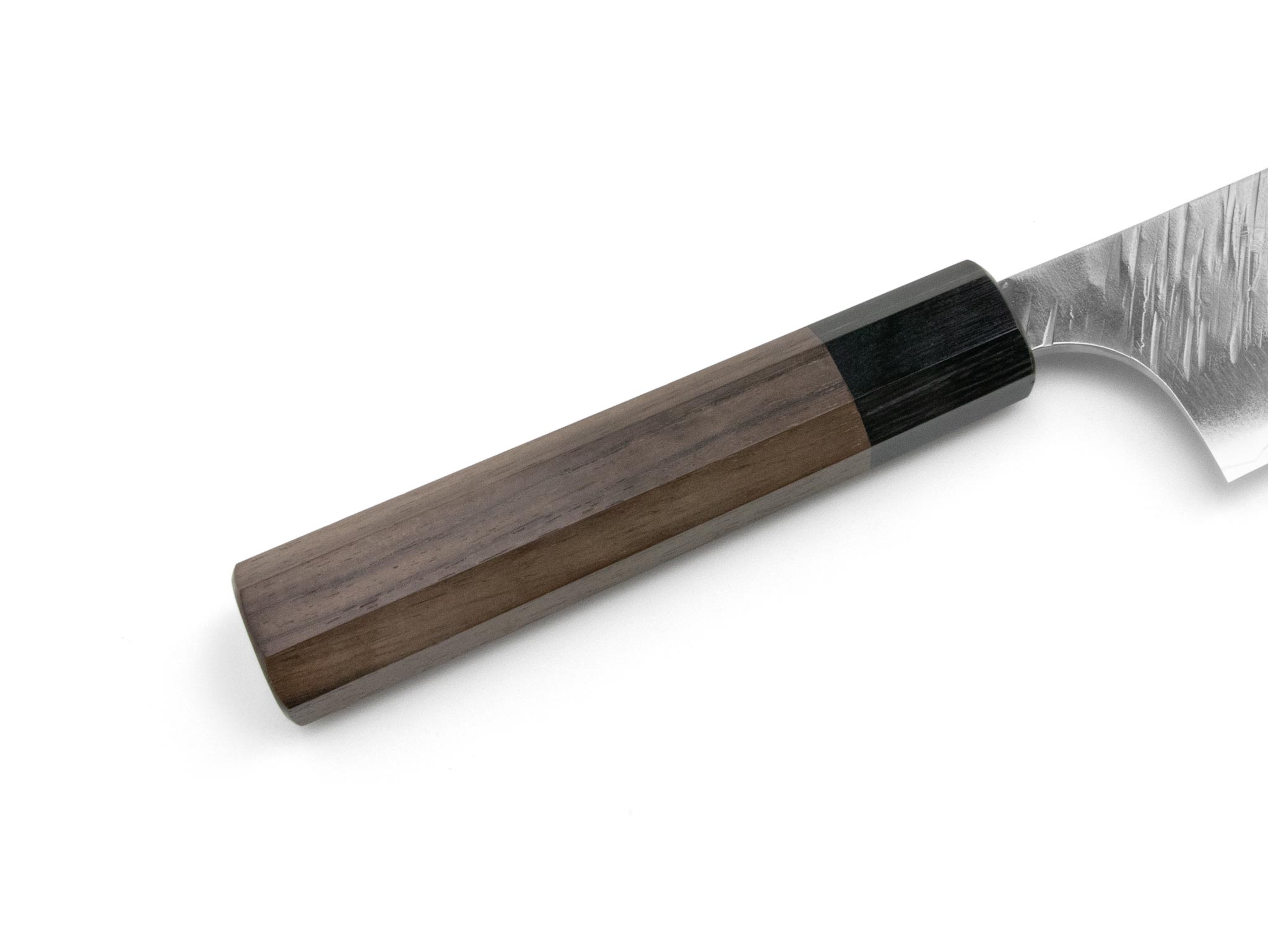 Die Sasame Serie ist eine relativ neue, aber nicht allzu verbreitete Serie von Yu Kurosaki. Diese Serie ist hochglanzpoliert, hat ein für Yu Kurosaki charakteristisches Tsuchime-Finish und bietet die von Kurosaki-san gewohnte erstklassige Schneidperformance. Der Griff aus Kirschholz mit roter Pakkaholz Zwinge rundet die Optik ab und macht das Messer zu einem echten Hingucker.
