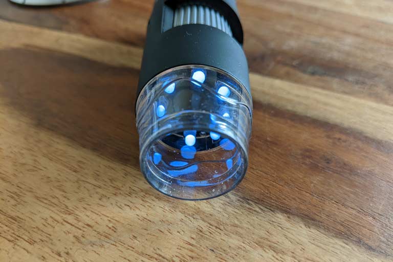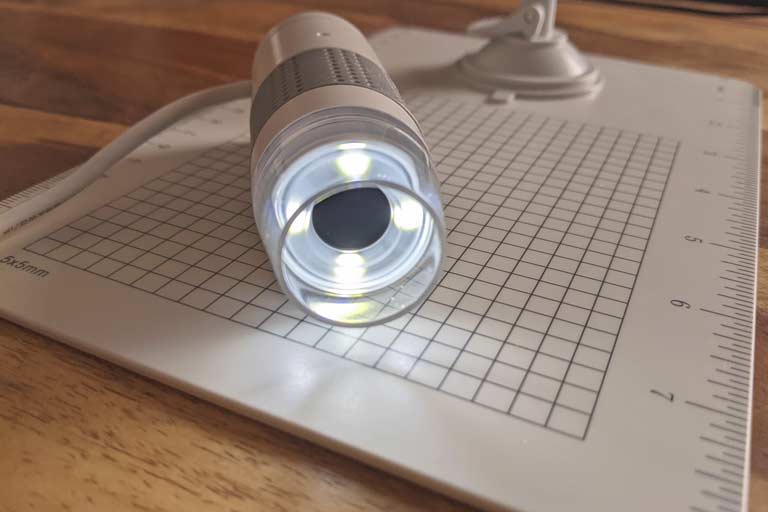 Die Wichtigkeit des Standfußes ist eine Sache, die mir erst bei Benutzung aufgefallen ist. Bei Messerschneiden muss beispielsweise in einigen Fällen der Winkel geändert werden, weil die Oberfläche des Messers das Licht der LEDs spiegelt. Leider ist es jedoch so, dass ein Standfuß mit Schraube entweder zu fest ist und sich die Position nicht ohne die Schraube zu lockern verändern lässt oder er gibt in vielen Positionen nach. Das ist besonders ärgerlich, wenn man durch das Einknicken des Standfußes die Position verliert und man das USB Mikroskop erneut einstellen und fokussieren möchte.