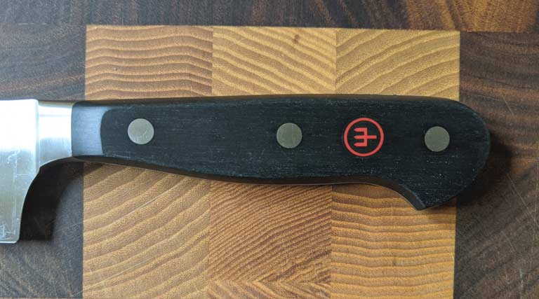 Der Balancepunkt ist beim getesteten 16cm Wüsthof Classic mit Halbkropf in etwa bei der vorderen ersten Niete.